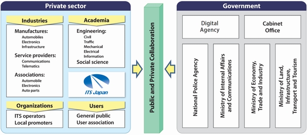 ITS Japan is made up of representatives from ITS-related organizations, industry, private companies, and academia. ITS Japan shares information and exchanges opinions with government ministries and agencies related to ITS.