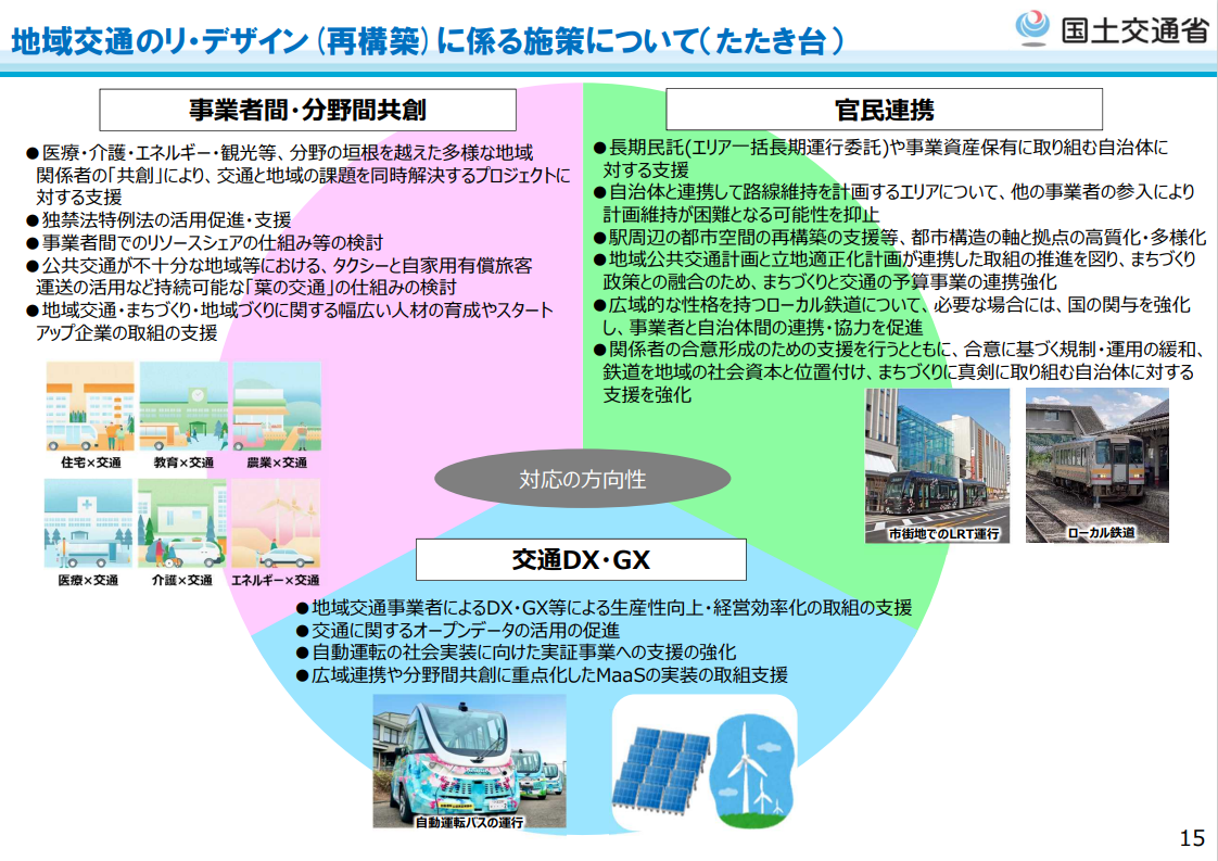 持続可能性・生産性を向上させる。「交通DX」「交通GX」については経営改善支援事業を、「3つ