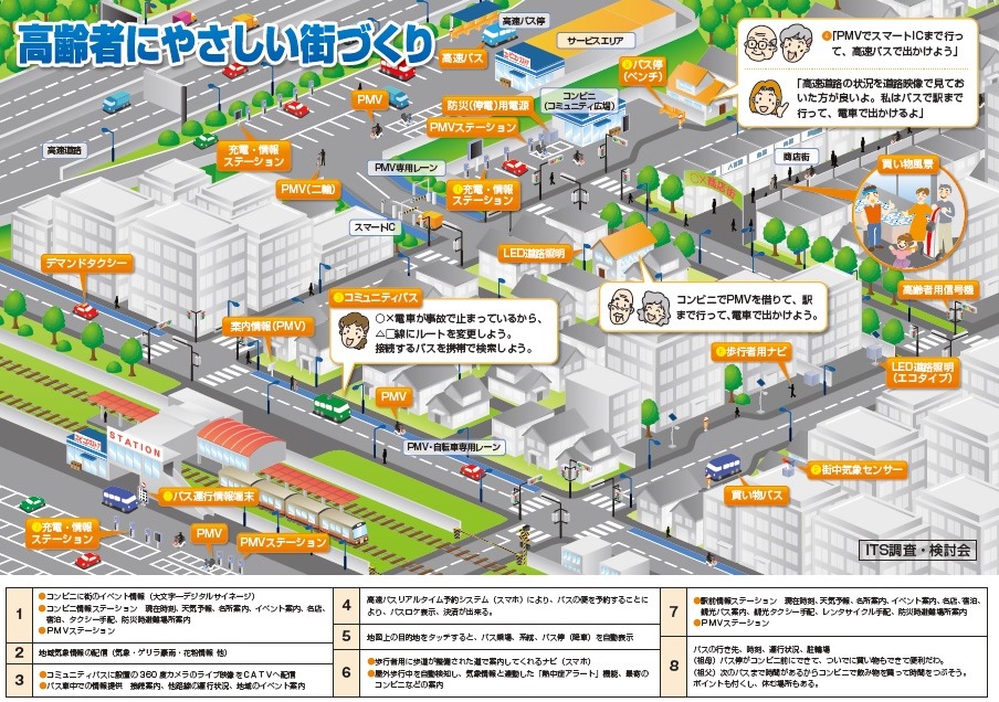 調査により得られた知見に基づき、「街の中にあると便利なもの」についての検討会メンバーの提案と、試乗した超小型自動車の高齢者の移動への適用などを議論し、各種サービスを織り込んだ「高齢者に優しい街づくり」をイメージ図としてまとめました。活動のまとめを【会員限定ページ】に記載しました。