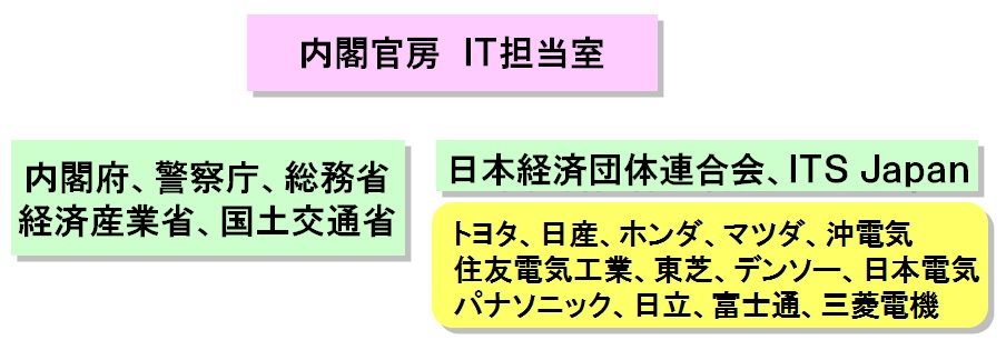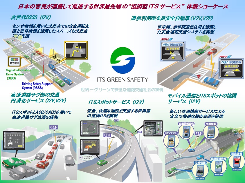2006年から推進してきたJ-Safety プロジェクトの結果として、2011年、ITSスポットとDSSSの実用化が実現しました。さらに、「新たな情報通信技術戦略」及び「ITSに関するロードマップ」に基づき、官民が連携して安全運転支援システムなどの普及・発展を進めるため、関係省庁及び産業界で構成するITS推進協議会が2011年12月再開しました。